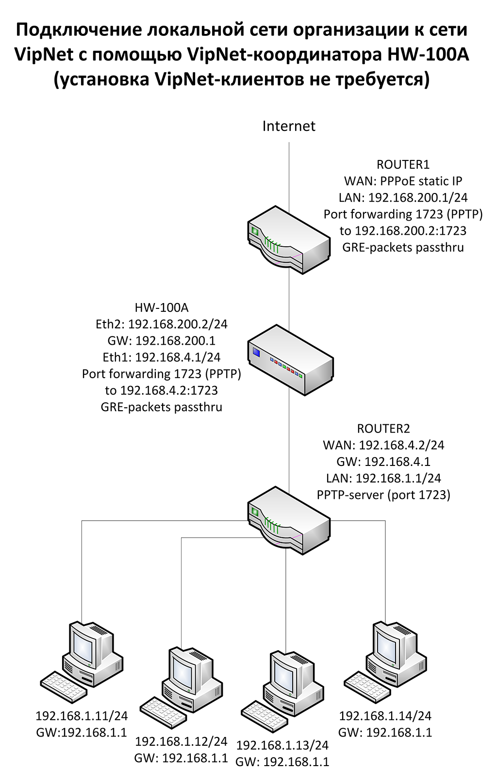 - Отказаться от приобретения и установки VipNet клиентов, приобрести один VipNet координатор HW100A (в настоящее время в линейке продуктов Infotecs эта модель заменена на HW50A).