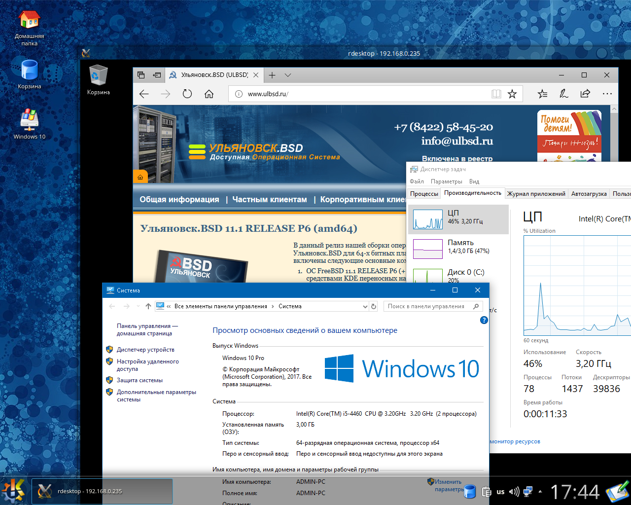 В Ульяновск.BSD можно работать в двух и более операционных системах одновременно. Так называемые гостевые операционные системы можно запускать на виртуальных машинах в гипервизоре bhyve, интегрированном в операционную систему. Причём гостевые операционные системы могут быть запущены одновременно со стартом основной (хостовой) операционной системы без участия пользователя. Для чего это нужно обычному пользователю настольного компьютера? Например, чтобы работать с программным обеспечением, аналогов которого нет в хостовой операционной системе.