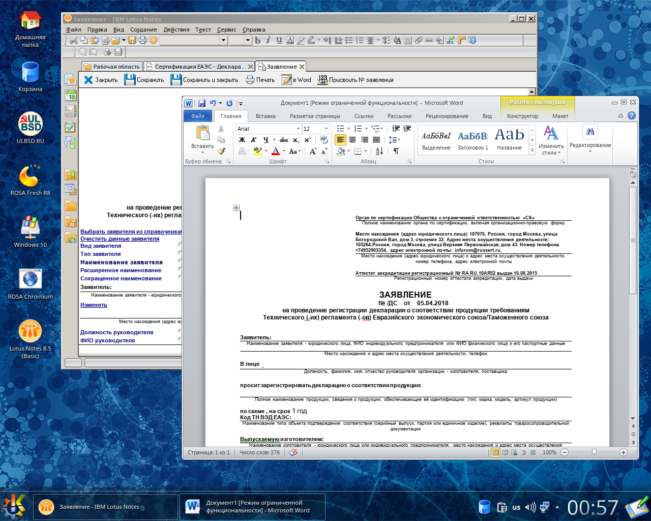 В итоге можно вполне комфортно работать в Lotus Notes и Microsoft Office. Ярлыки всех устанавливаемых под wine приложений появляются в меню «Приложения» → «Wine» → «Programs».