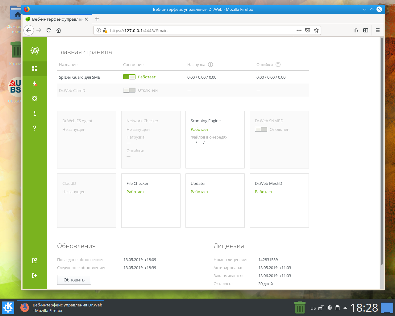 Если с лицензией всё нормально, то нужно сразу обновить все компоненты Dr.Web до последней версии: