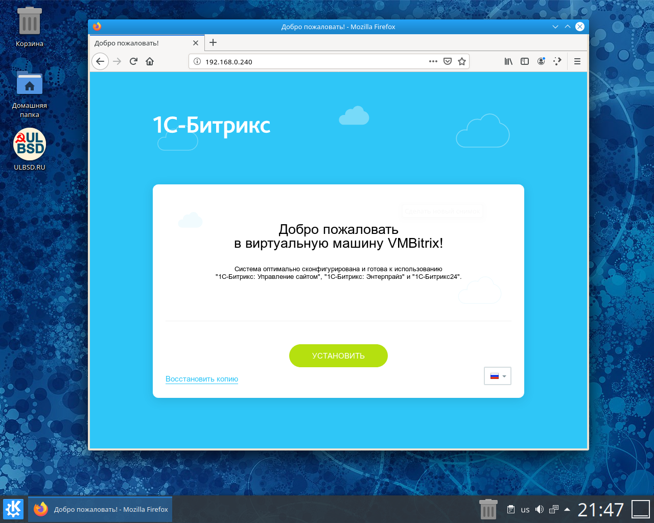 После этого можно перезапустить машину. Если всё нормально, то, открыв в любом браузере ссылку http://192.168.0.240, должна отобразиться первоначальная страница «1C-Битрикс: Виртуальная машина», с которой можно будет установить необходимый вам вариант дистрибутива продукта «1C-Битрикс». Дальнейшую информацию для изучения можно найти на сайте «Виртуальная машина» – учебный курс.