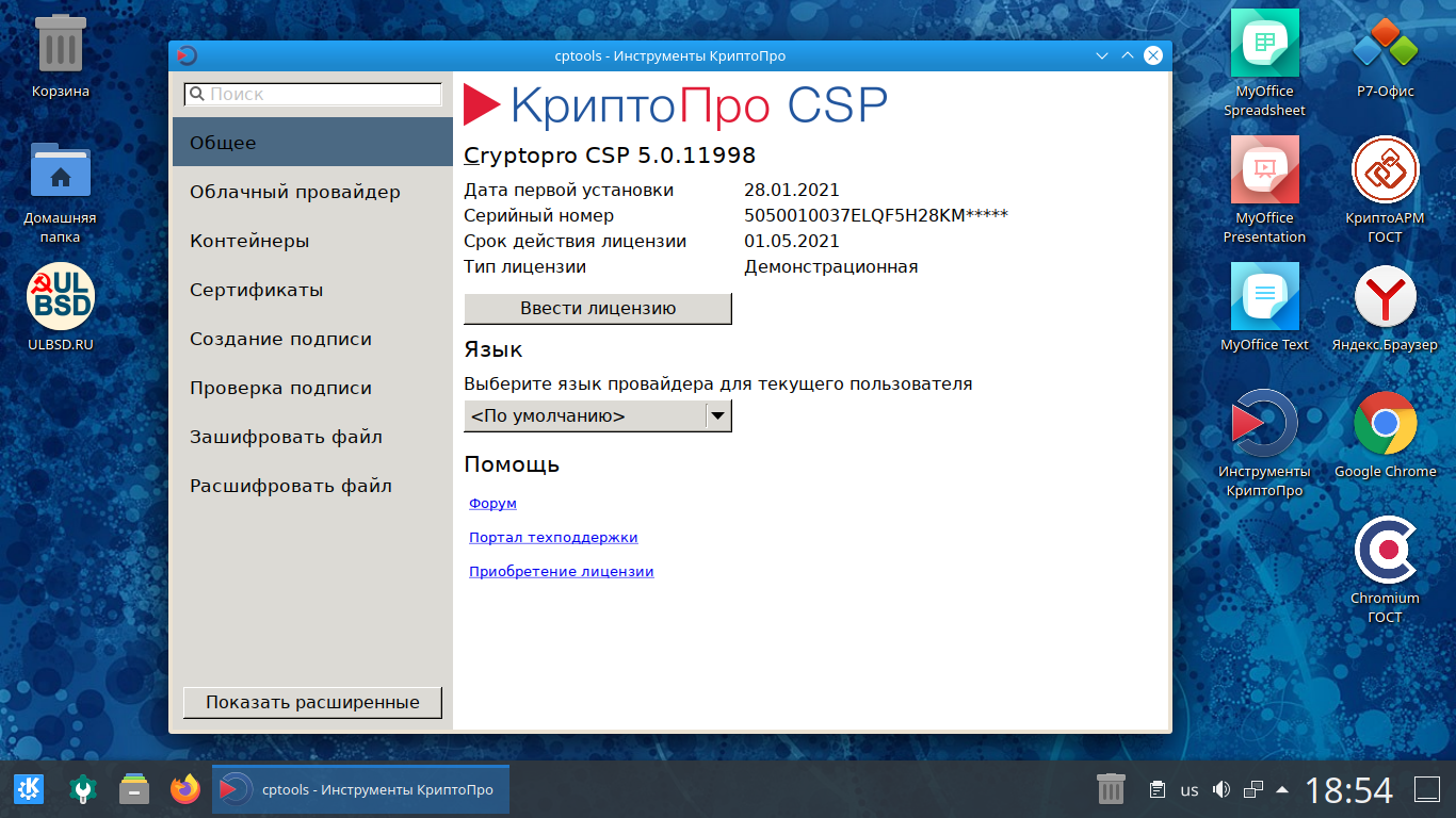 #Ввод лицензионного ключа для КриптоПро: